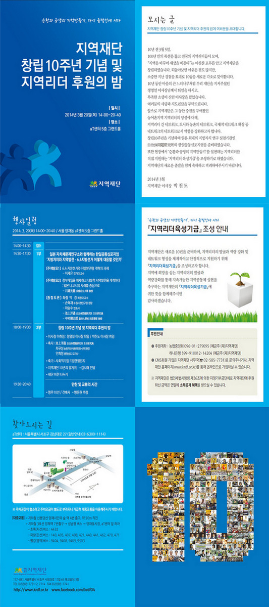 지역재단 창립10주년 기념 및 지역리더 후원의 밤, 3월20일(목) 2시:세미나,6시:기념식, 양재동 aT센터
