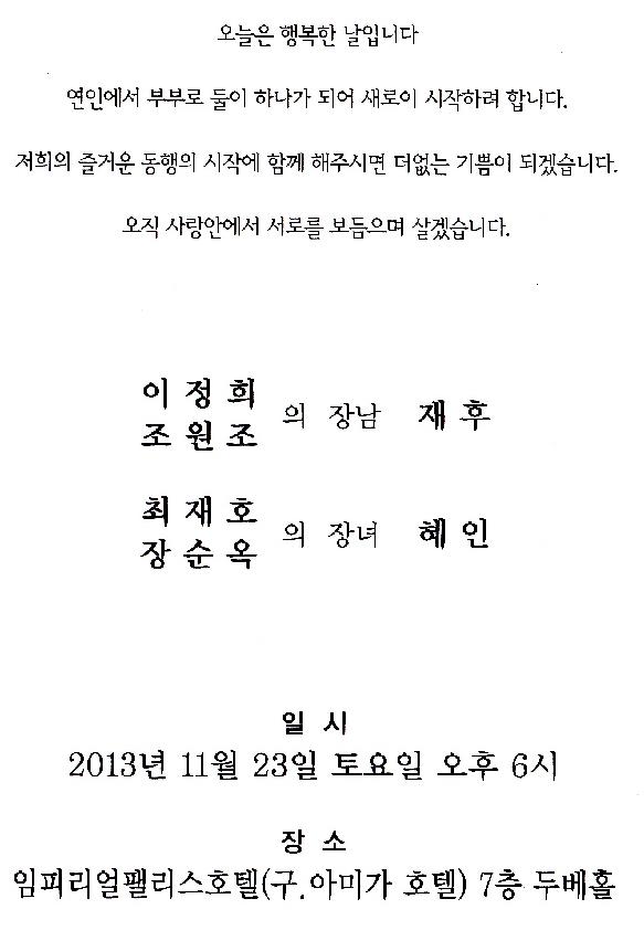 결혼 알림 - 이정희 장남, 11월23일(토) 6시, 임피리얼팰리스 호텔(7호선 학동역1번출구250m)
