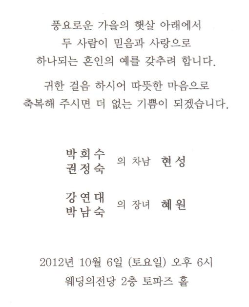 결혼 알림 - 박희수 차남, 10월6일(토) 6시, 웨딩의전당(삼성동 봉은사 옆)