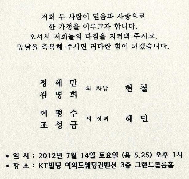 결혼 알림 - 정세만 차남, 7월14일(토) 1시, KT 빌딩 여의도 웨딩컨벤션 3층(여의도역2번출구 도보10분)