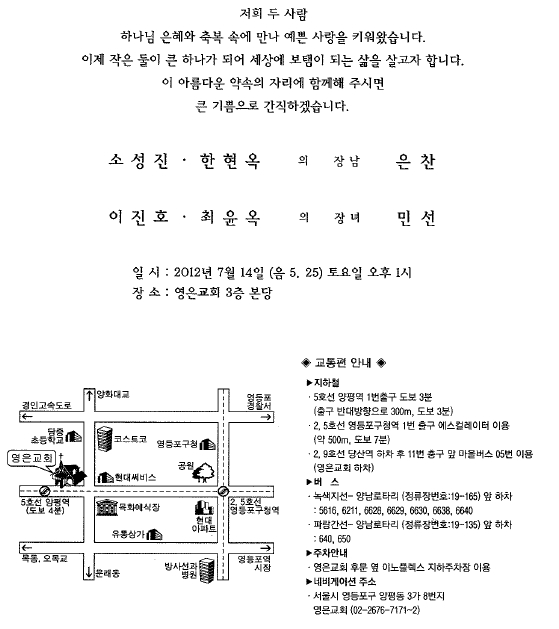 결혼 알림 -소성진 장남 결혼,7월14일(토)1시, 영은교회(양평역1번출구 반대방향 도보3분)