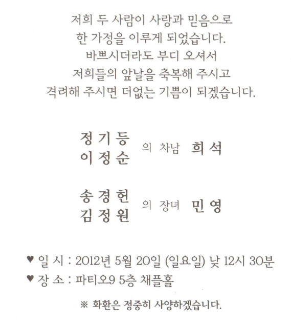 결혼 알림 - 손정수 장녀, 6월16일(토) 11시30분, 해오름교회(관악구 행운동),낙성대역8번출구320m