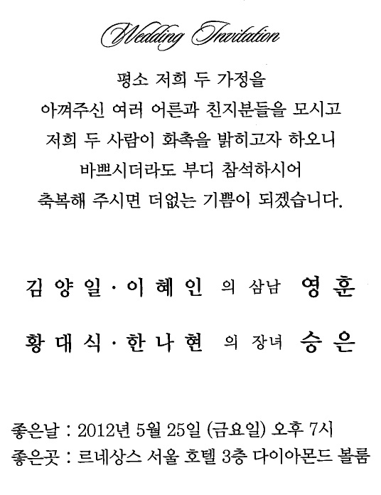결혼 알림 - 황대식 장녀 결혼, 5월25일(금) 7시, 르네상스서울호텔 3층다이아몬드볼룸,