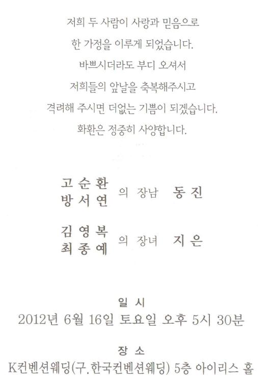 결혼 알림 - 고순환 장남, 6월16일(토)5시30분, K 컨벤션웨딩5층,개봉역2번출구 도보5분