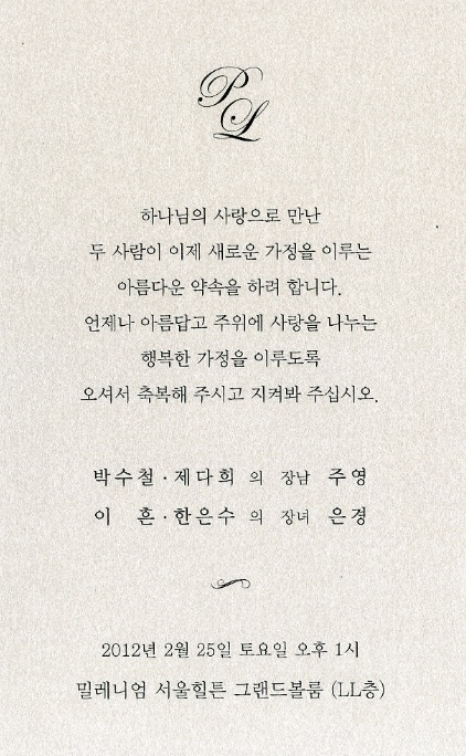 결혼 알림 - 이흔 장녀, 2월25일(토)1시, 밀레니엄 서울 힐튼호텔 그랜드볼룸(서울역8번출구700m)