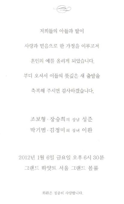 청첩 - 조보형 장남결혼,1월6일(금) 6시30분,그랜드 하얏트서울 그랜드볼룸.