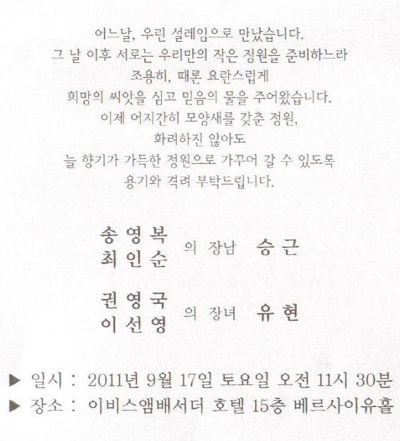 청첩 - 송영복 장남결혼,9월17일(토)11시30분,이비스앰베서더호텔 15층베르사이유홀(동수원 소재)