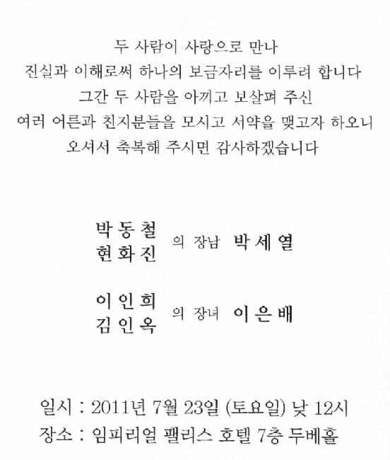 청첩 - 박동철 장남 결혼, 7월23일(토)12시, 임피리얼팰리스호텔 7층 두베홀(학동역1번출구 도보5분)