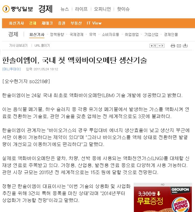 축 - (주)한솔이엠이(대표이사 :정형근 동기) 국내 최초로 액화바이오메탄(LBM) 기술 개발