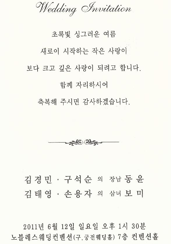 청첩 - 김경민 장남 결혼, 6월12일(일) 1시30분, 노블레스웨딩컨벤션(구궁전웨딩홀)7층(수원 소재)