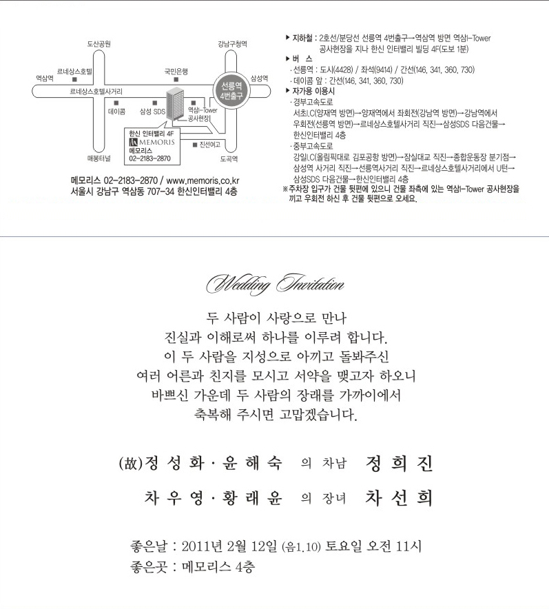청첩 - 고 정성화 차남 결혼, 2월12일(토)11시, 메모리스 4층(선릉역4번출구부근)