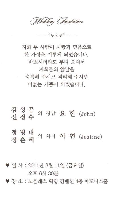 청첩 - 고 정성화 차남 결혼, 2월12일(토)11시, 메모리스 4층(선릉역4번출구부근)