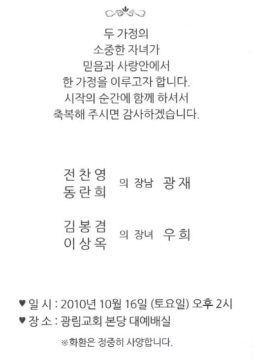청첩 - 전찬영 장남 결혼, 10월16일(토) 2시, 광림교회 본당 대예배실(압구정역 4번출구 도보5분)