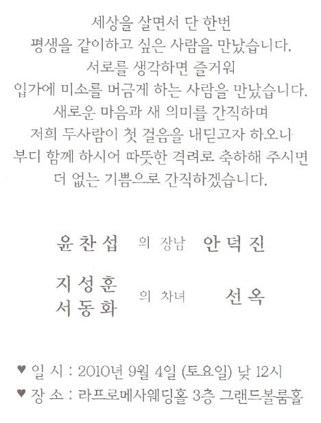 청첩 - 지성훈 차녀 결혼, 9월4일(토)낮12시, 라프로메사웨딩홀 3층그랜드볼룸(안양종합운동장부근)