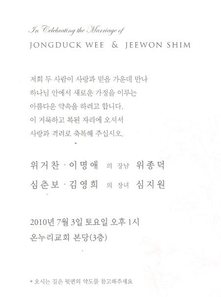 청첩 - 위거찬 장남 결혼, 7월3일(토) 1시, 온누리교회 3층(본당)