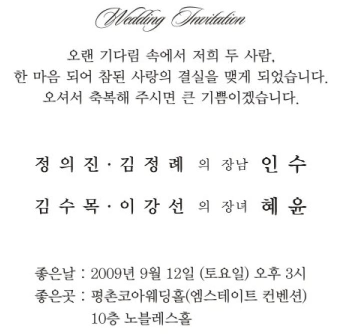 청첩 - 정의진 장남 결혼, 9월12일(토) 3시, 평촌코아웨딩홀 10층 노블리스홀