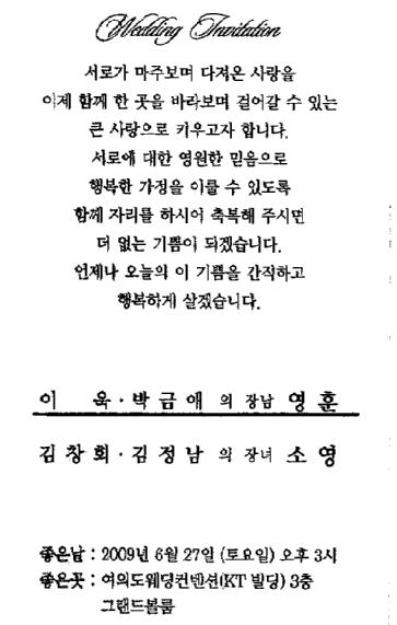 청첩 - 이욱 장남 결혼, 6월27일(토)3시, 여의도 웨딩컨벤션 (KT빌딩) 3층 그랜드볼룸