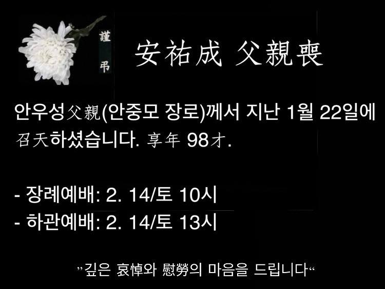 안우성父親(안중모 장로)께서 지난 1월 22일에 召天하셨습니다. 享年 98才.