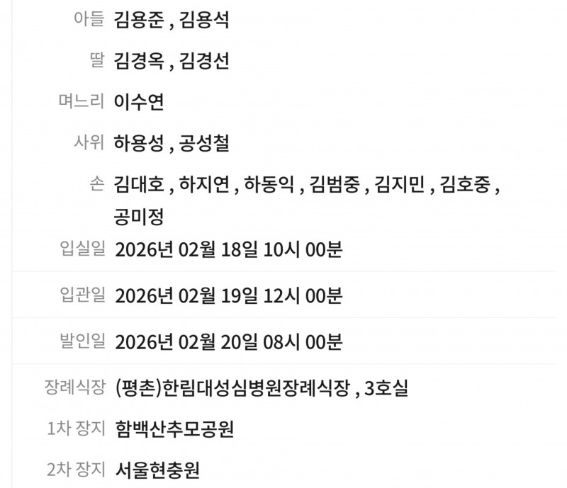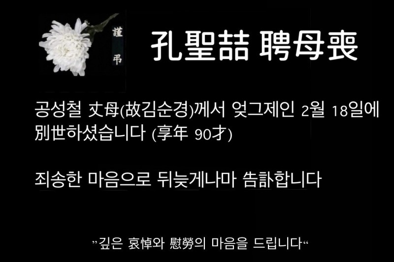 공성철 丈母(故김순경)께서 엊그제인 2월 18일에 別世하셨습니다 (享年 90才)