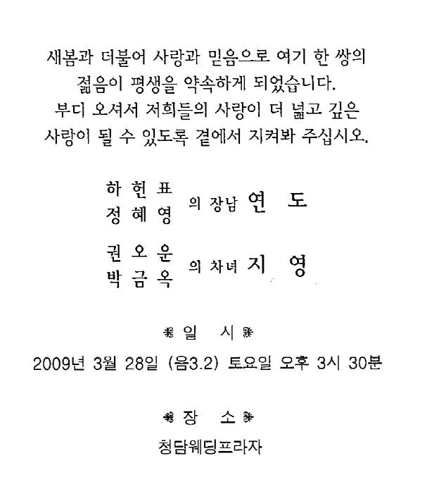 청첩- 하헌표 장남 결혼, 3월28일(토) 3시30분, 청담웨딩프라자(청담사거리)