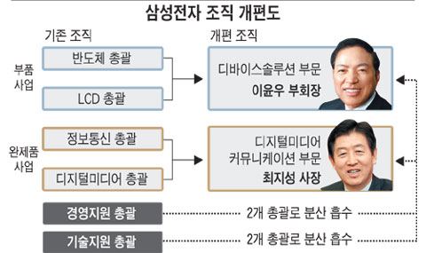 삼성전자는 이번에 6개로 나뉘어져 있는 총괄조직을 2개 조직으로 압축했다. 기존 '반도체 총괄'과 'LCD 총괄'을 '디바이스솔루션(DS) 부문'으로, '정보통신 총괄'과 '디지털미디어 총괄'을 '디지털미디어&커뮤니케이션(DC) 부문'으로 통합했다. 쉽게 말해 전자제품에 들어가는 부품 사업부를 'DS부문', 휴대폰·TV 등 완제품 사업부서를 'DC부문'으로 합친 것이다. 새로 개편한 DS부문장은 이윤우 대표이사 부회장이, DC부문장은 최지성 사장이 각각 맡아 삼성전자는 '투톱(two top) 체제'로 운영된다.