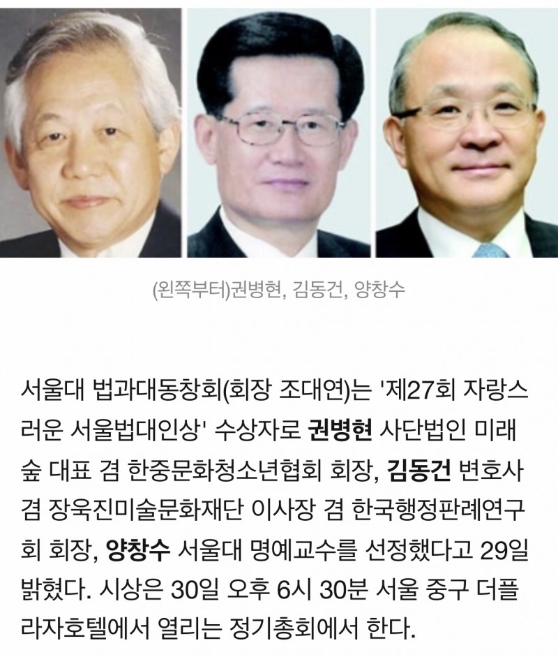 자랑스러운 벗, 양창수,가 서울법대동창회에서 『제27회 자랑스러운 서울법대인』상 수상자로 선정됐습니다