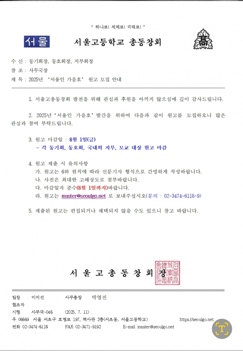 서울고 총동창회에서 발행하는 계간지 서울인 가을호 원고를 모집합니다.